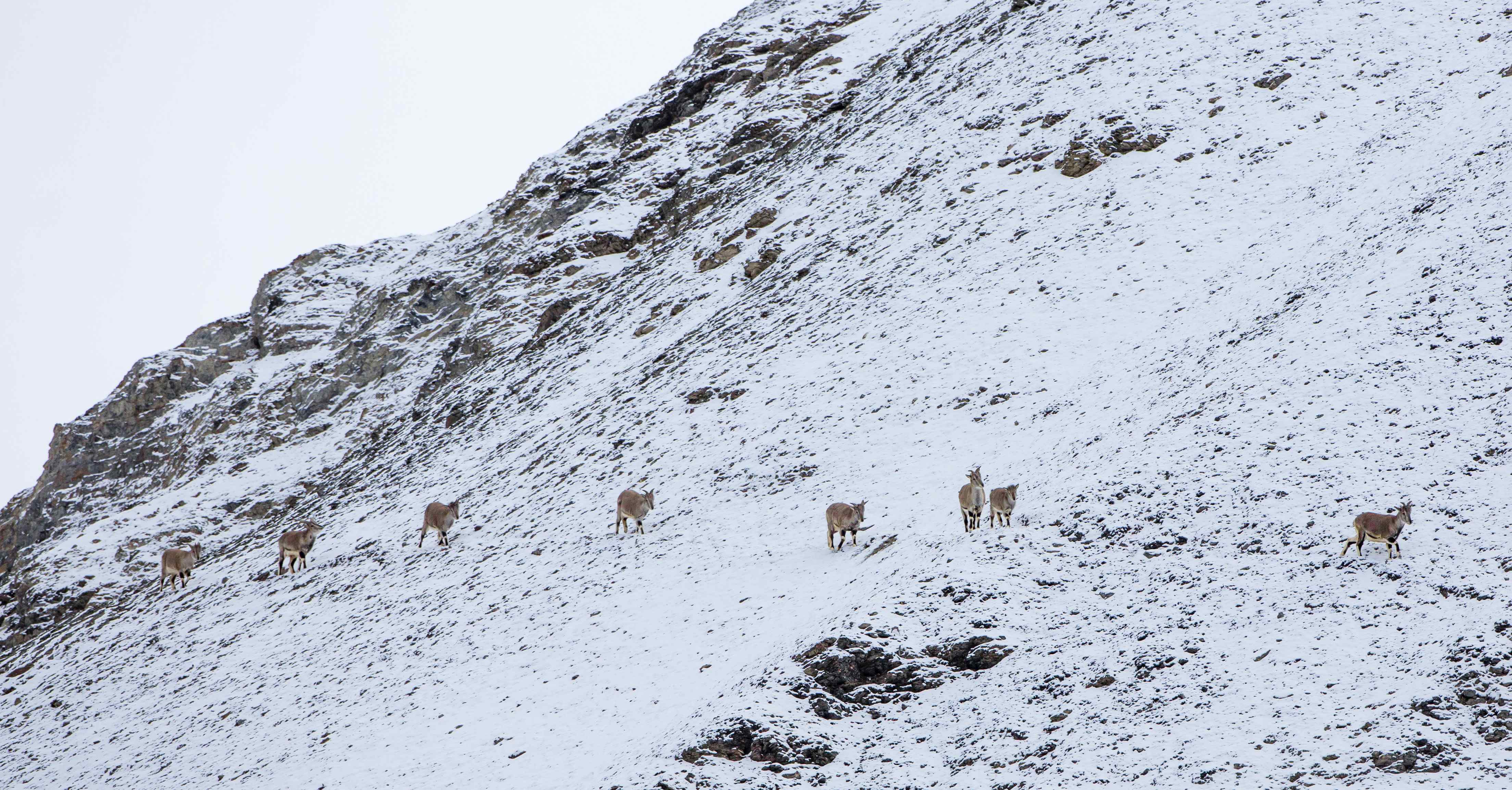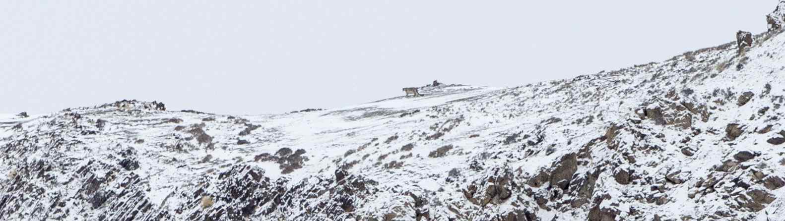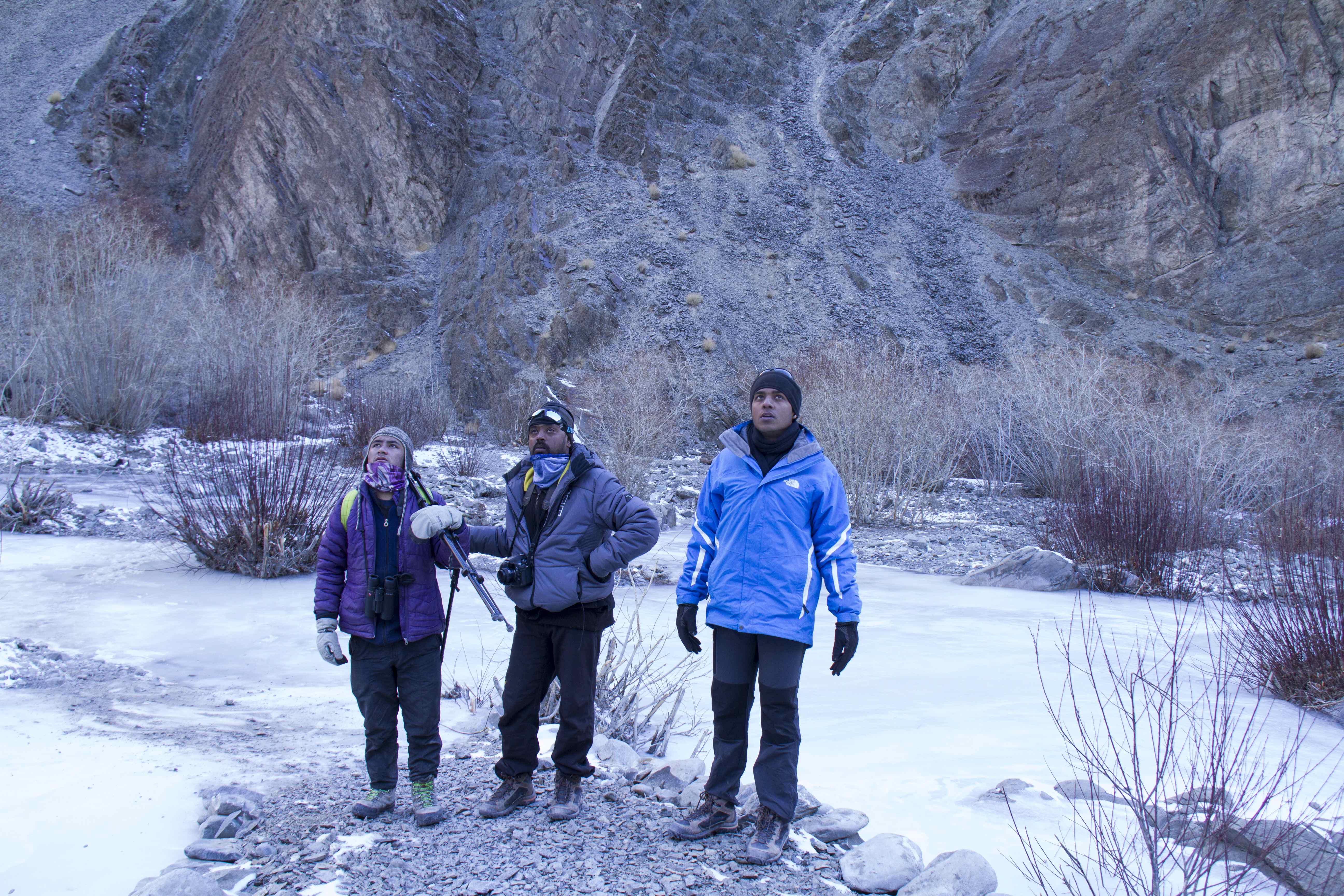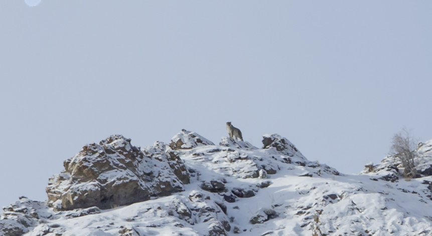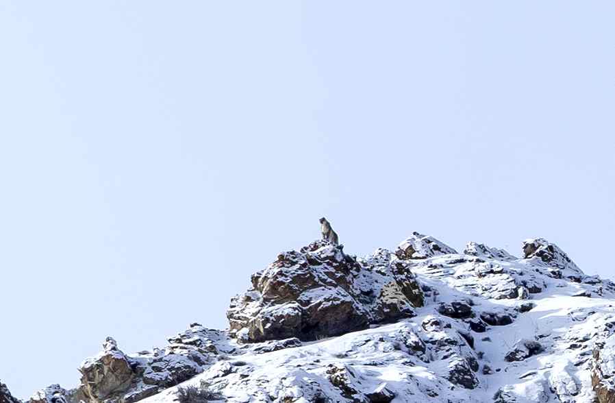 The next sighting happened two days later (day 6)  again around the same time under similar circumstances . This time too , the sighting happened after it snowed and this time all of us were gathered on a ridge close to the camp .  Apparently there were tow of them and the guides said they were a mating pair. But we could spot only the male which was on the ridge against the skyline .  The third sighting was a brief on on the evening of Day 7 . In the morning all of us had gathered at Tarbung Valley to hopefully see the mating pair but did not succeed in doing so . Post returning camp , Varun and I had gone on an evening walk along the frozen river towards Rumbak Valley . We had been walking for a while when Little Nuno came shouting “Paaji ..Paaji ” Shaan ” . Again it was a mad lung popping dash up some ridge . Shiva had organized for my camera bag to be brought to the ridge and when I went there , panting like a dog, I found my camera was already set up on the tripod !!  Talk of teamwork !!  This sighting was very brief as he disappeared behind a rock as it appeared he was stalking a blue sheep.  We waited greedily for him to emerge with the Kill , but without success .