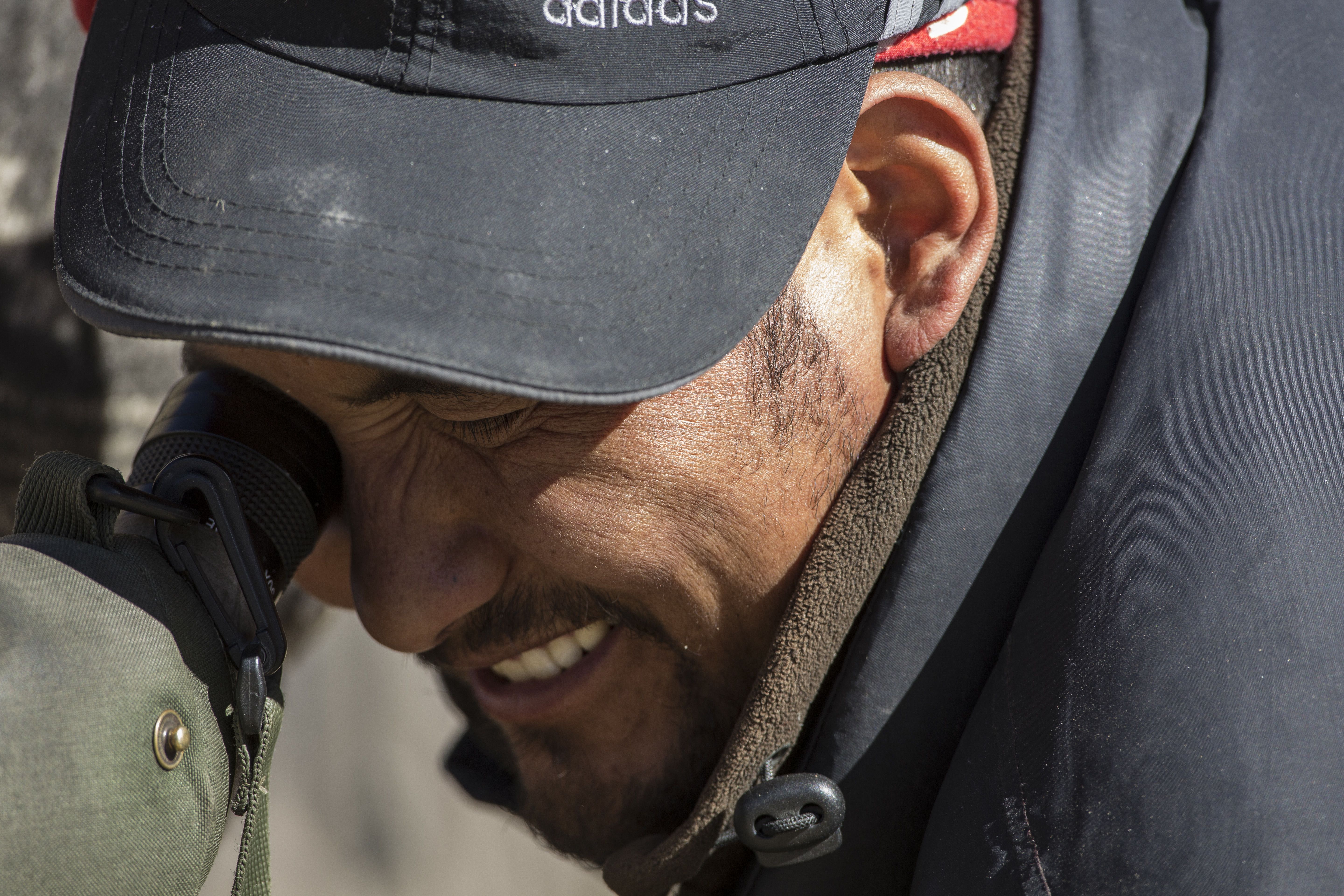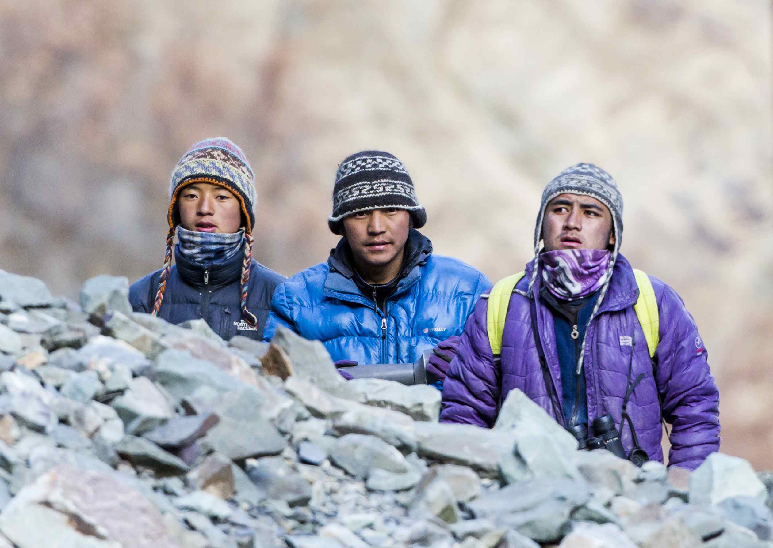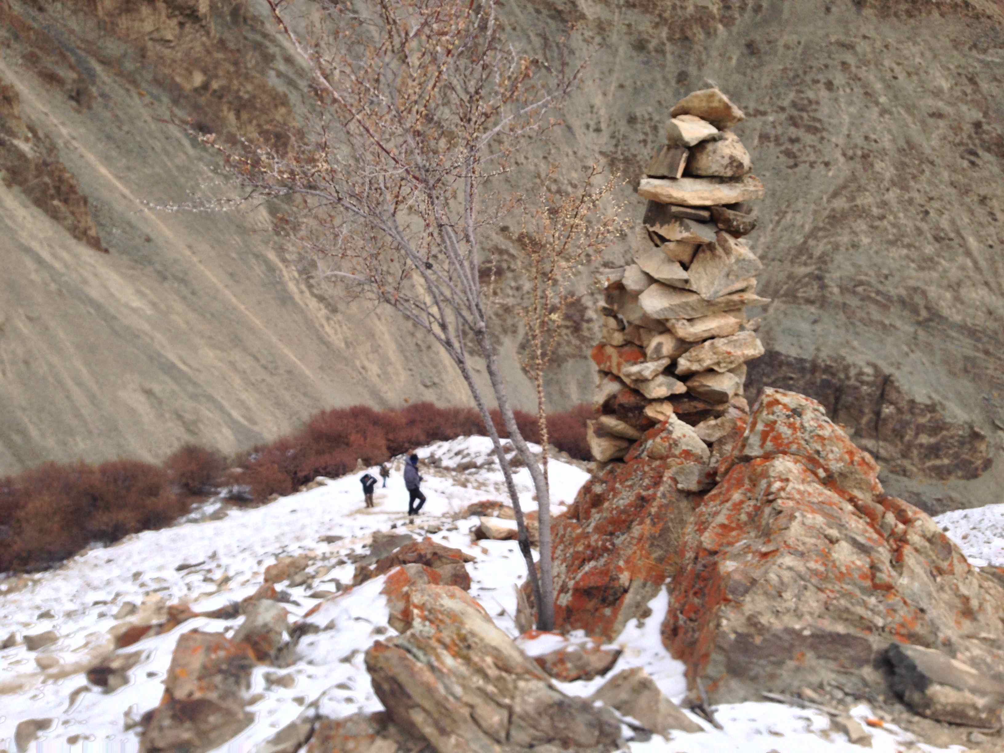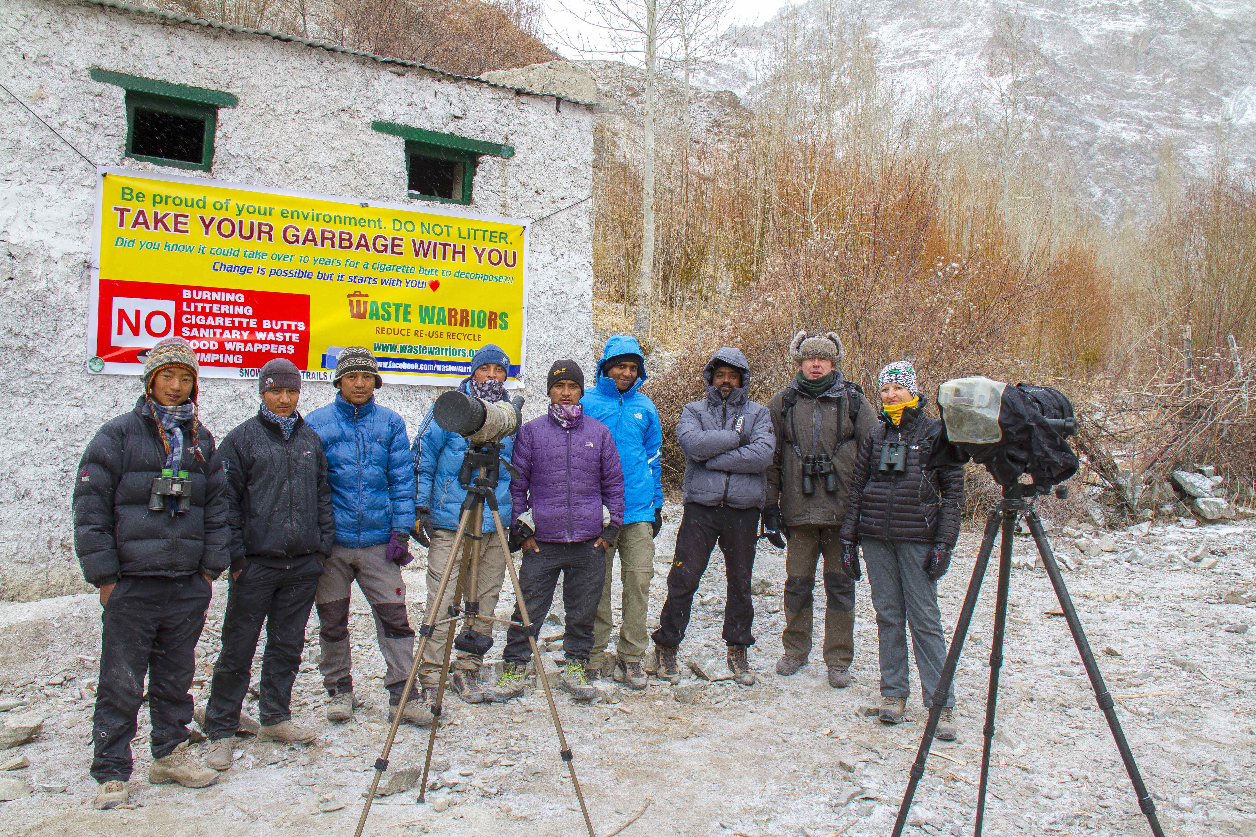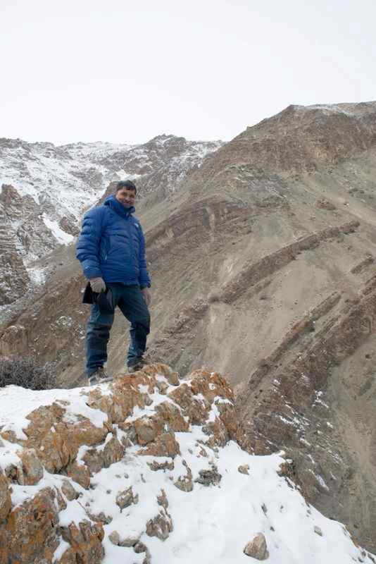 The daily routine consisted of the trackers looking for tell tale signs of the Lamba Dhum from pug marks and other signals .  Each group had its own Tracker and some of the them like Smanla and Jigmet Dadul were very senior experienced trackers accompanying other groups . Once they determined the area where they thought the chances of spotting the leopard was high,  we had to get ready and a short but lung bursting trek of  anything between 30 and 90 minutes would take us atop one of the ridges where we would set up our cameras and wait .  Some of these climbs were so steep and on such uneven terrain that I rediscovered my fear of heights that I had successfully shed years ago.  On day two , I remember in the afternoon the ridge I had to get on to involved such a scramble on my part I almost went into a panic .  On the way down , I didn’t hesitate to ask for little Nuno’s help to negotiate the climb down.  The others in the group did not seem to have any problems , making me take refuge under the fact that I was the oldest member of the group . I donned the Thatha avatar for the first time !!