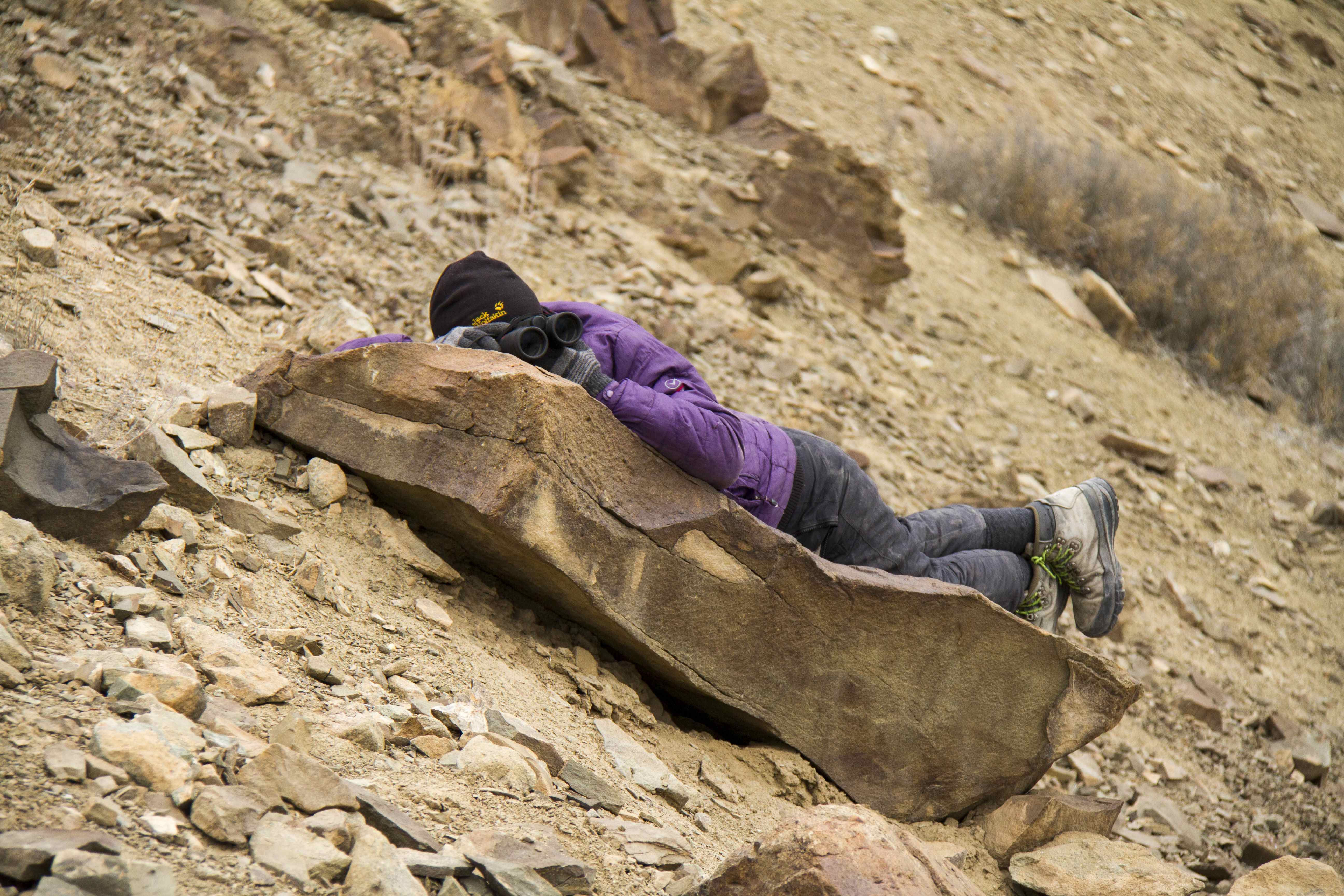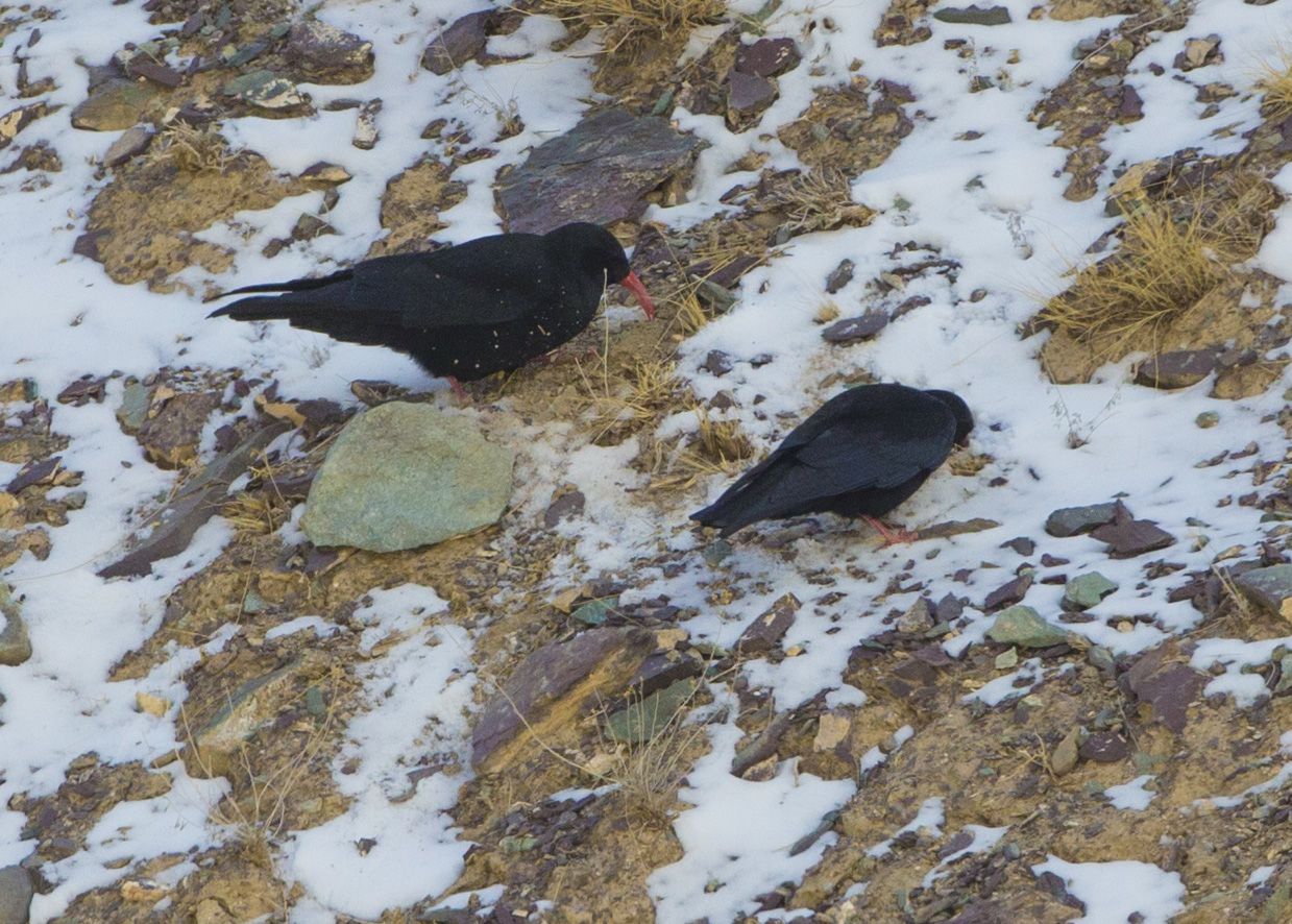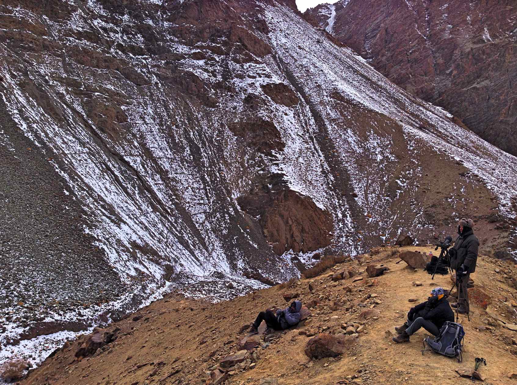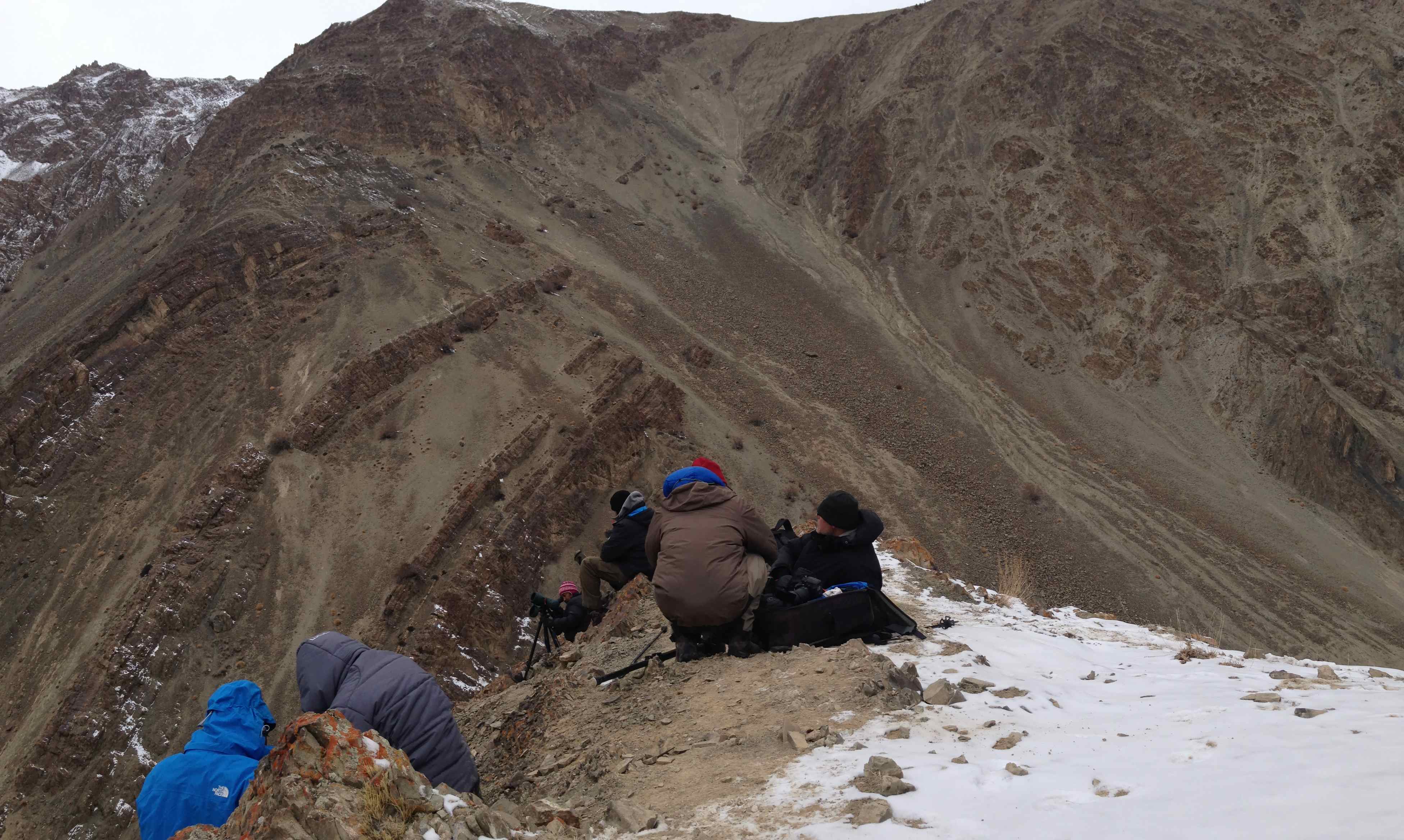 Essentially tracking involves peering through a pair of Binoculars or Spotting scope for hours , systematically scanning the ridges and mountain tops for signs of movement of any species.  Just looking into one of these for more that 10 minutes made one dizzy and therefore the respect for what these people did just so that we could see the mystical creature went up several notches .   In the process of scanning they came across other species like blue sheep , snow cocks , golden eagles, lamergiers etc that we got a chance to spot and photograph when we were on the ridge . Otherwise just standing on the Ridge was what Varun described as plain masochism  , especially when there was a wind blowing. Tamchos and the other guides helpfully suggested that we sit on the leeward side of the ridge , which would offer protection against the bone chilling wind . This involved some tricky maneuvers and positioning oneself  appropriately